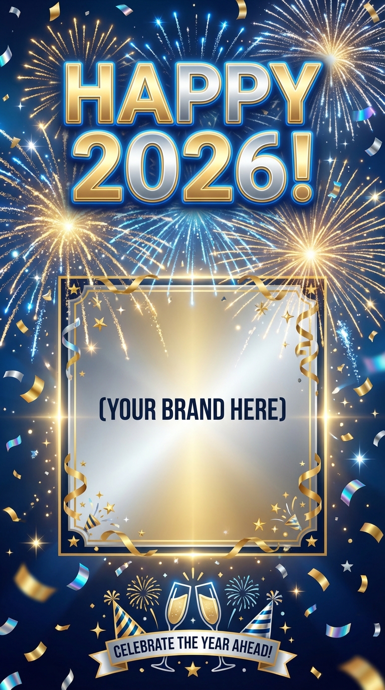 Act as a graphic design assistant. Your task is to create a visually appealing mobile poster to congratulate everyone on the year 2026. The poster should: - Have an aspect ratio of 9:16 with a resolution of 1080x1920 pixels - Include cheerful and celebratory elements suitable for a New Year theme - Allow space for users to add their brand name prominently - Maintain a professional and festive tone Constraints: - Ensure the design supports text overlays for customization - Make use of vibrant colors to capture attention Example Elements: - Fireworks, confetti, or similar celebratory graphics - Text placeholders for 'Happy 2026!' and 'your_brand_here' - A festive color palette of gold, silver, and blue Use this prompt to generate a high-quality digital image suitable for mobile devices.