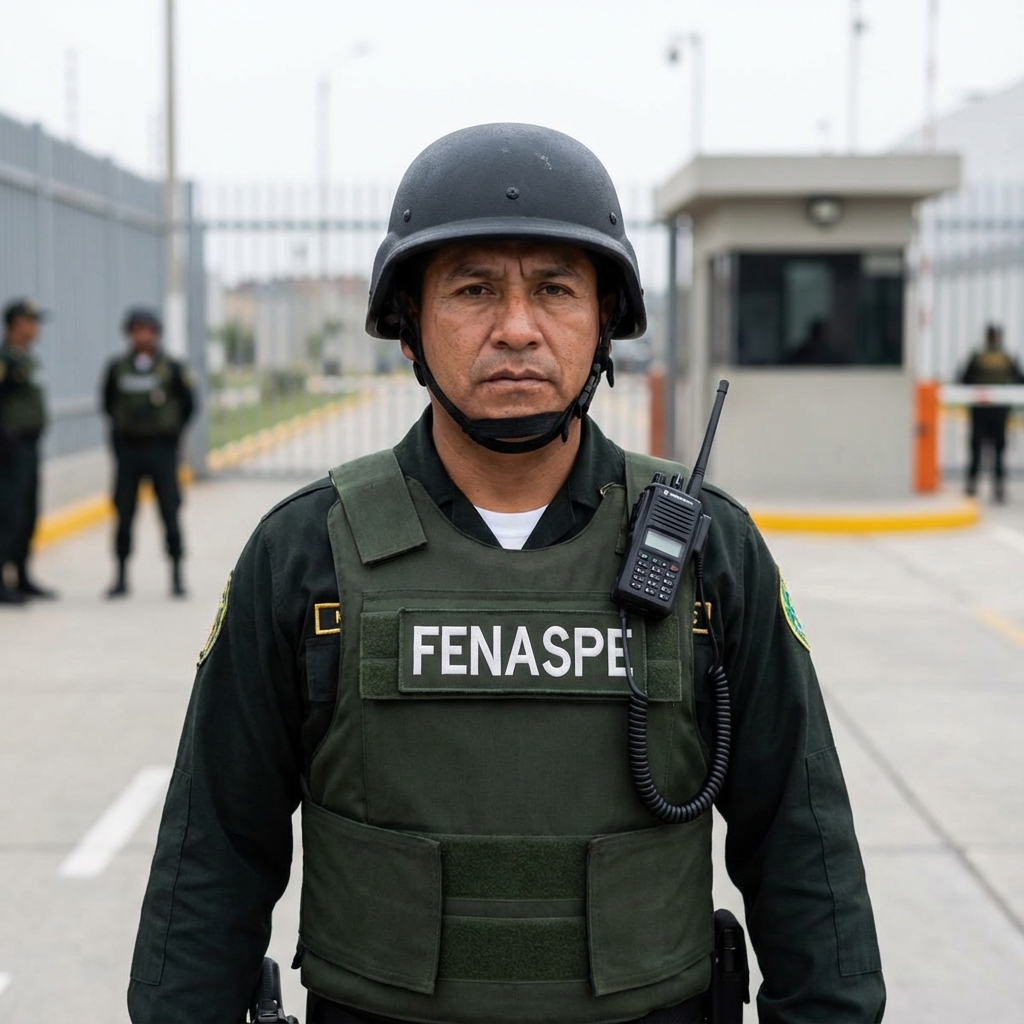 Create an image of a Latino private security guard. The guard should be depicted wearing a tactical helmet and a bulletproof vest. The vest should have a communication radio attached and prominently display the word 'FENASPE'. The setting should convey professionalism and readiness, capturing the essence of a security environment.