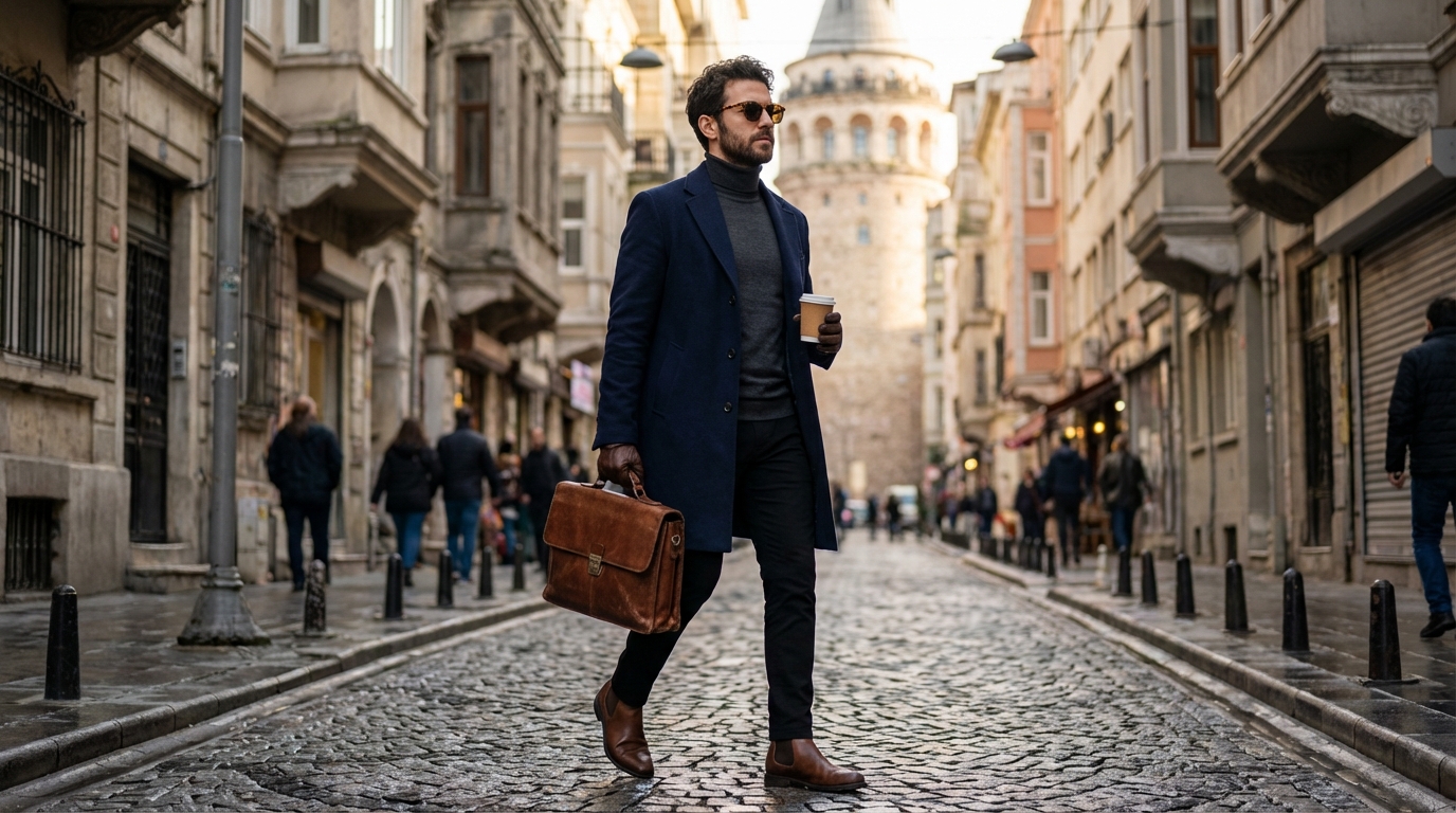 Full-body cinematic shot of a sophisticated man in his early 30s walking confidently down a historic cobblestone street in Istanbul, Beyoğlu. He features a short beard and dark hair. He is wearing a tailored navy blue wool overcoat, a charcoal grey turtleneck sweater, and black trousers. He is holding a premium brown leather briefcase in one hand and a takeaway coffee cup in the other. He is wearing brown leather Chelsea boots and stylish sunglasses. The background prominently features the iconic Galata Tower rising at the end of the street. Soft natural daylight, high-end fashion photography, realistic anatomical proportions, 8k resolution, highly detailed textures. --ar 9:16