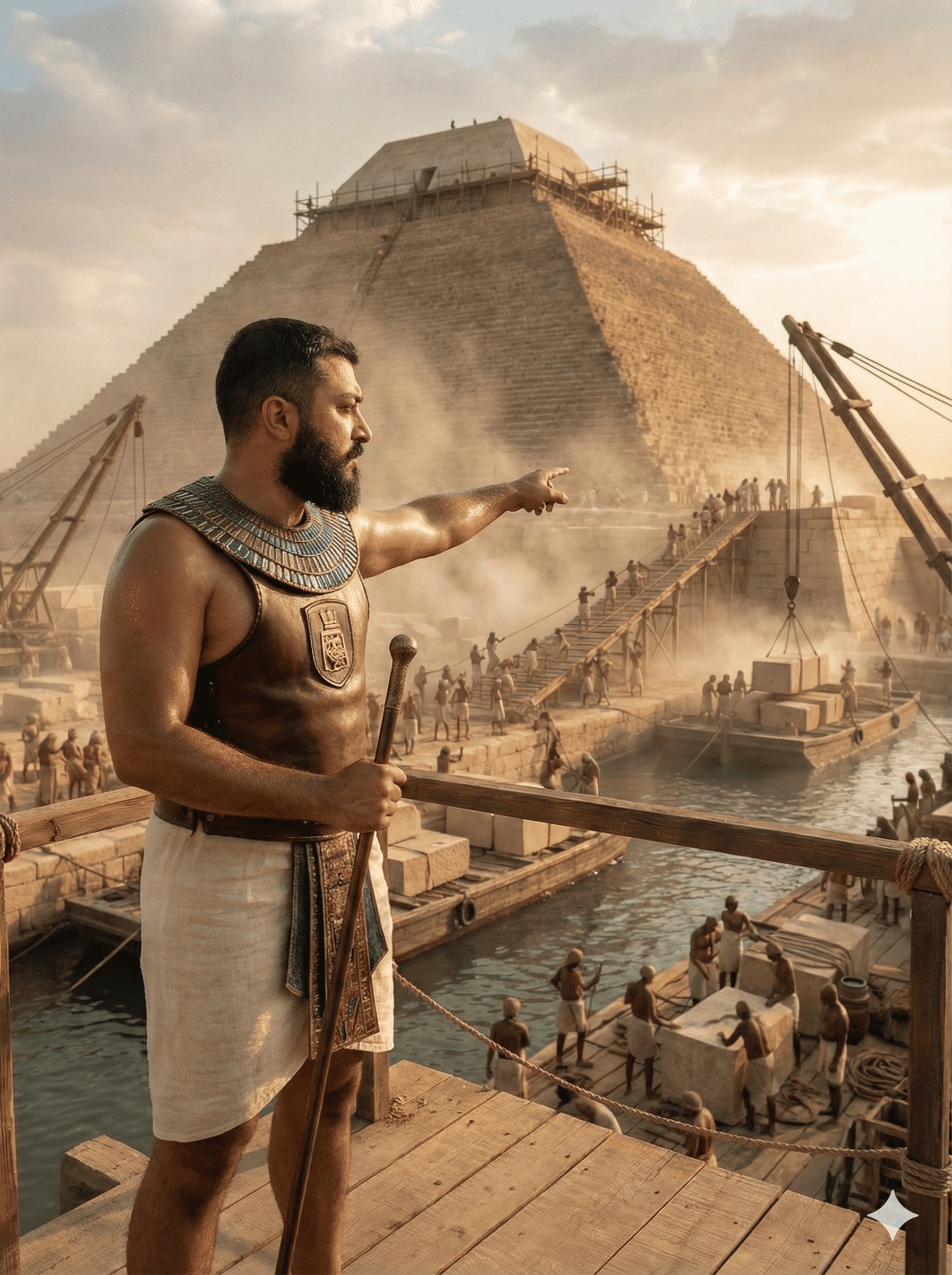 Hyper realistic 4K cinematic scene from ancient Egypt during the construction of the Great Pyramid. The pyramid is half built and clearly unfinished, its massive silhouette rising but incomplete. Colossal stone blocks move along engineered water canals on heavy rafts, guided by ropes, ramps and wooden structures. Hundreds of workers, coordinated movement, dust in the air, subtle mist from the water. Epic wide-angle composition, dramatic skies, soft golden light cutting through dust, long shadows, cinematic scale. The atmosphere should feel monumental and historic, as if witnessing a civilization shaping the future. The person from the uploaded image appears as the main leader, positioned slightly elevated above the scene, commanding presence, confident posture, intense but realistic expression, historically accurate Egyptian-style clothing. Ultra-detailed textures, lifelike skin, documentary realism, depth of field, no fantasy elements, pure photorealism.