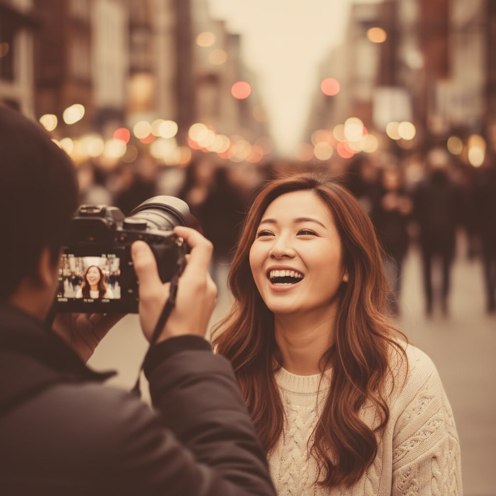 Create a cinematic street photography scene with a focus on capturing candid moments of joy and emotion. This prompt guides you to visualize a warm, vintage-style photograph featuring a joyful young woman in a bustling urban environment. It emphasizes composition, lighting, and narrative elements to produce a realistic and heartwarming image.