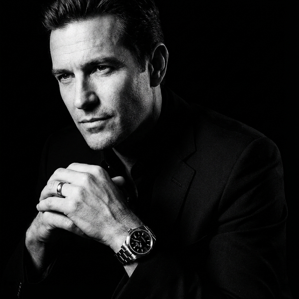 Please upload your selfie to generate an ultra-realistic black-and-white portrait. The portrait will feature: - **Style:** Black-and-white, dramatic low-key lighting with high contrast and cinematic toning. - **Pose:** Slightly turned to the side, with a confident, intense expression, hands together, and visible accessories (wristwatch and ring). - **Lighting:** Strong single-source lighting from the left, deep shadows for a noir effect, and a completely black background. - **Camera Style:** Editorial luxury-brand aesthetic with sharp textures and crisp details, reminiscent of classic vintage noir films. Ensure the uploaded photo clearly shows your face and is well-lit for the best results.