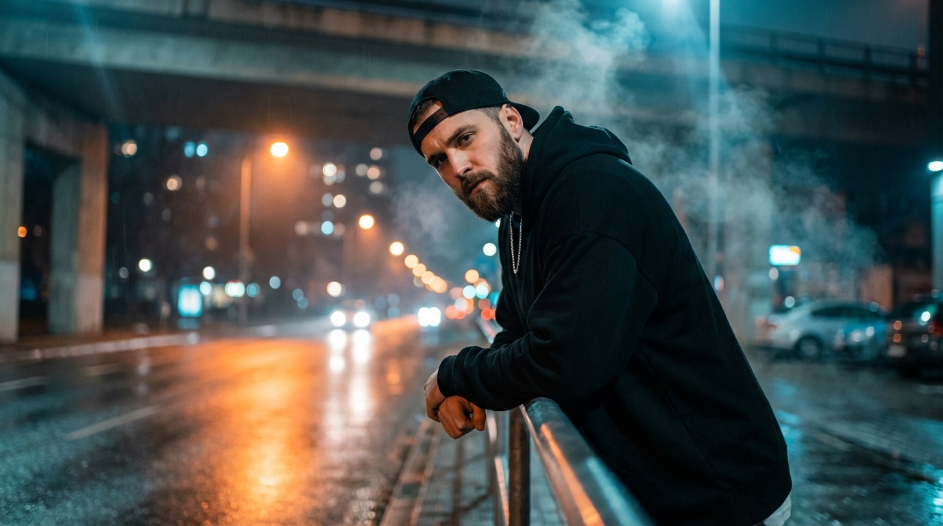 A high-fidelity image prompt designed to create a dramatic, low-angle urban portrait. This scene captures a subject in dark streetwear (hoodie and cap) sitting in a night city environment, characterized by wet asphalt, atmospheric smoke, and bokeh city lights. The prompt emphasizes a moody orange-and-teal color grading with sharp focus and photorealistic textures, perfect for album covers, social media profiles, or character concept art.