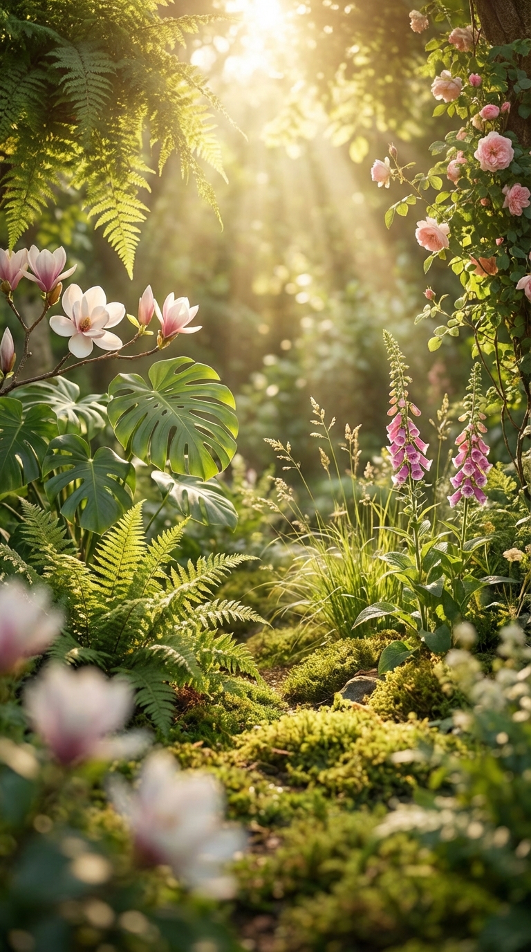 Create an image for a hero section with a 16:9 aspect ratio. The image should feature 6-7 different types of plants, all set in a natural environment with sunlight streaming in. Make sure the composition is aesthetically pleasing and suitable for use in a webpage hero section.