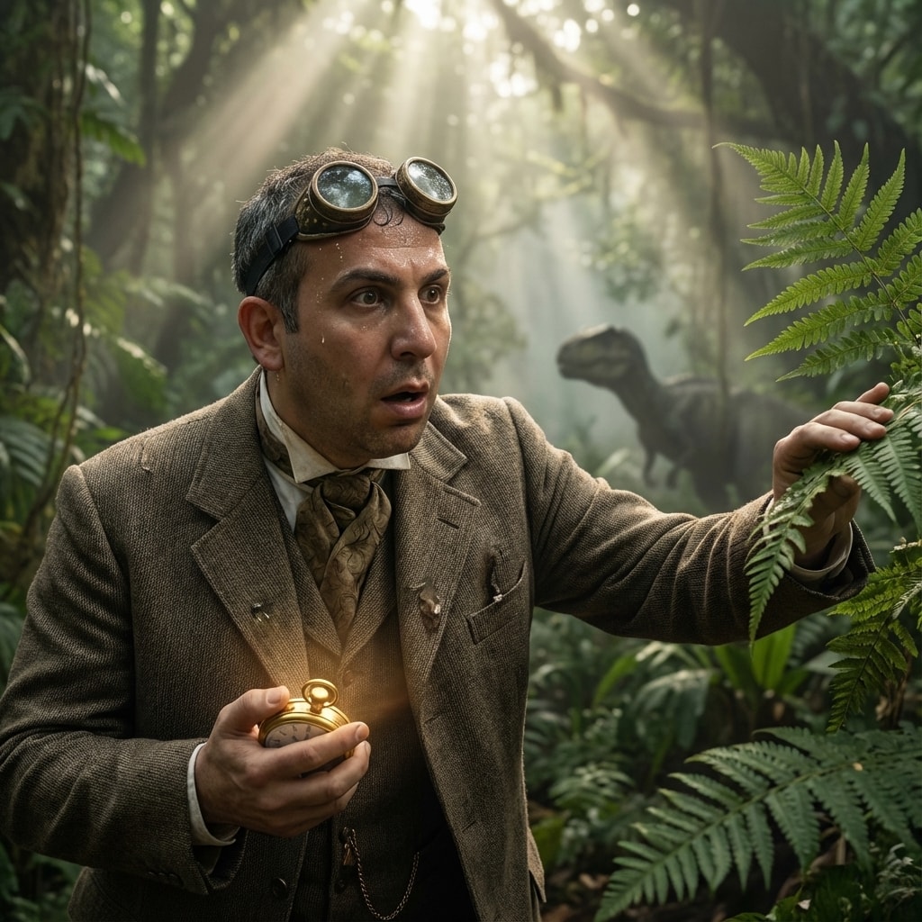 1{2 "prompt": "You will perform an image edit using the person from the provided photo as the main subject. Preserve his core likeness. Transform Subject 1 (male) into a Victorian time traveler who has just materialized in a dense, prehistoric jungle. The image must be Ultra-Photorealistic, Movie-Quality, and highly detailed. The scene captures the moment of arrival, shot on Arri Alexa with cinematic lighting and a shallow depth of field. He stands amidst towering ferns and ancient cycads, looking completely out of place in his formal 19th-century attire, contrasting the rugged, humid environment with his refined appearance.",3 "details": {...+64 more lines