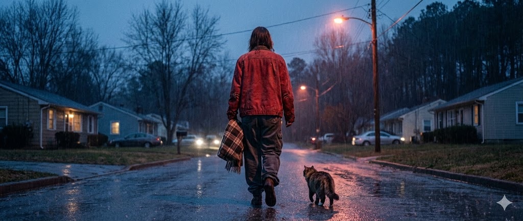 1image-generation:2 main: "An 1980s-style woman walking with a cat beside her, both in the foreground."3 clothes: "worn jacket, blanket and old pants."...+27 more lines