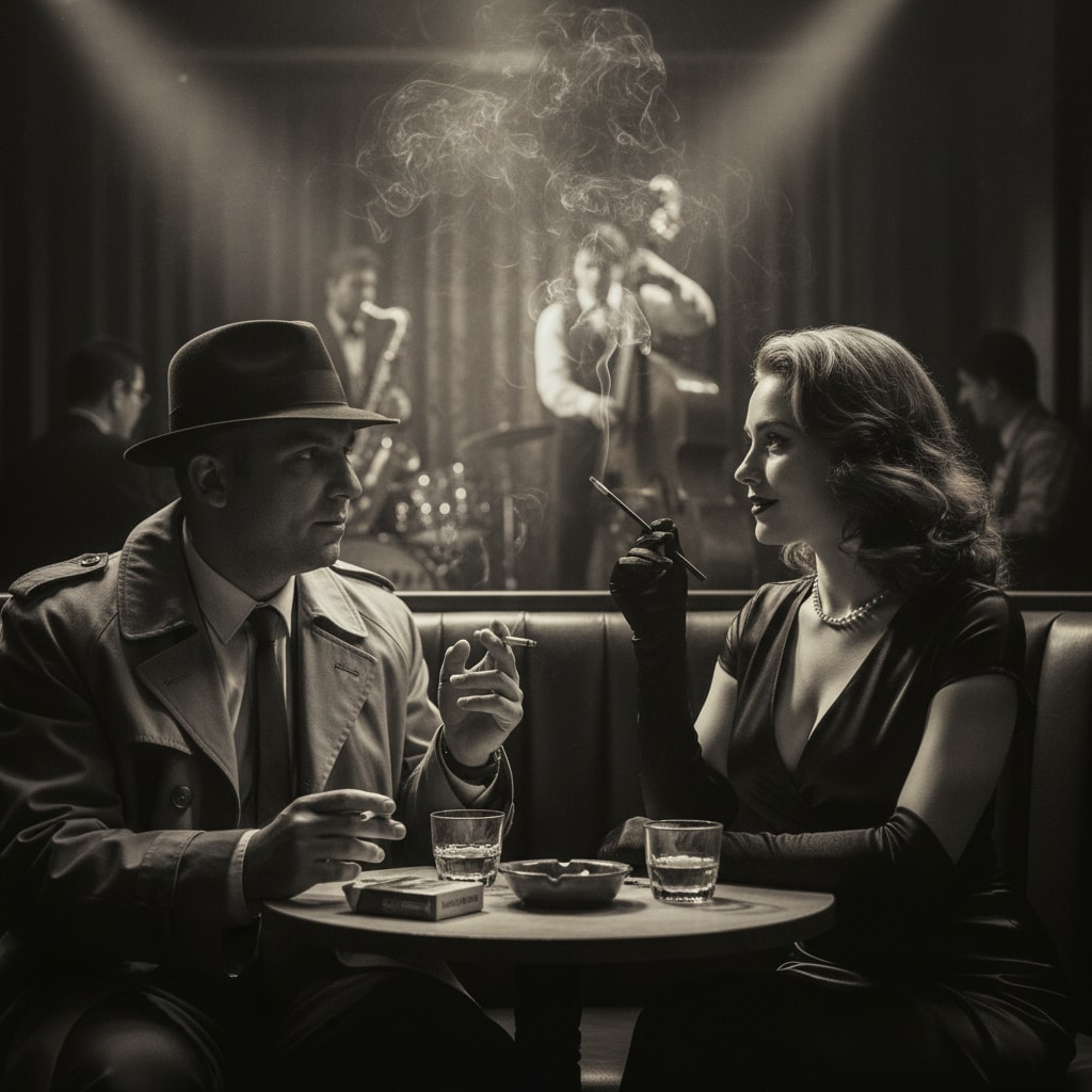 A tense, high-stakes meeting between a weary detective and a glamorous informant in a smoky 1950s jazz lounge.